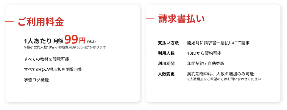 本サービスは年単位でのご契約となります。お支払いについては、利用開始月に一括でのご請求となりますので、あらかじめご了承ください。